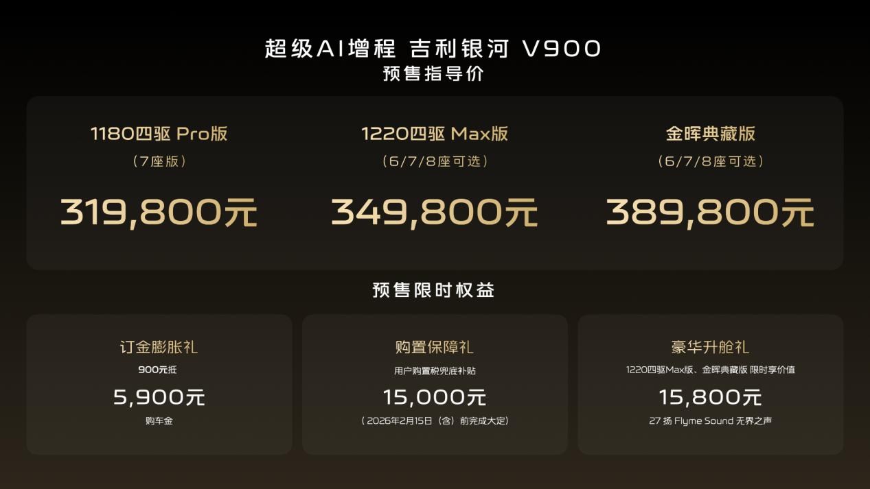 1月7日,吉利銀河旗下V系列的首發(fā)之作,“AI全場(chǎng)景家庭旗艦MPV”——吉利銀河V900正式開(kāi)啟預(yù)售,共計(jì)3個(gè)版本,預(yù)售指導(dǎo)價(jià)格區(qū)間為31.98萬(wàn)元~38.98萬(wàn)元。新車(chē)圍繞中國(guó)大家庭出行的真實(shí)需求,以寬奢空間、豪華駕控、全維安全、AI智能幾大全能滿配實(shí)力,重新定義豪華旗艦MPV價(jià)值標(biāo)準(zhǔn),樹(shù)立AI全場(chǎng)景豪華出行新高度。